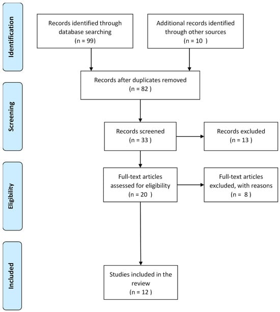 Our search retrieved 109 articles. After removing duplicates, 82 articles remained. Upon screening, 49 articles were removed at the title screening stage, 13 at the abstract screening stage, and another eight at the full-text screening stage, leaving 12 articles for inclusion in this scoping review [,,,,,,,,,,,] (Figure 1). Table 2 provides more details on the characteristics of the included articles. The data were synthesized into three themes, and Table 3 provides more details.