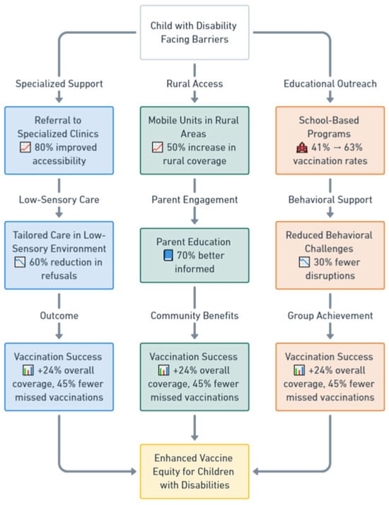 The flowchart illustrates the tailored immunization pathways for children with disabilities, starting with the central challenge, “Child with Disability Facing Barriers”. It features three main pathways: Specialized Support, Rural Access, and Educational Outreach. The Specialized Support pathway includes referrals to specialized clinics with 80% improved accessibility, leading to tailored care in low-sensory environments, which reduces vaccination refusals by 60%, and culminates in vaccination success, marked by + 24% overall coverage and 45% fewer missed vaccinations. The Rural Access pathway utilizes mobile units in rural areas, achieving a 50% increase in rural vaccination coverage, followed by parent education initiatives, where 70% of parents report being better informed, resulting in similar vaccination success outcomes. The Educational Outreach pathway employs school-based programs, improving vaccination rates in specialist schools from 41% to 63%, coupled with behavioral support that reduces disruptions by 30%, ultimately leading to vaccination success. The pathways converge on the goal of Enhanced Vaccine Equity for Children with Disabilities. Icons enhance clarity, such as a hospital symbol for specialized clinics, a book for parent education, and a school for school-based programs. Metrics, such as “80% improved accessibility” and “70% better informed”, are based on study findings. At the same time, the color coding—blue for specialized support, green for rural access, and orange for educational outreach—helps differentiate pathways visually. The outcome emphasizes significant improvements in coverage and equity for children with disabilities.