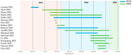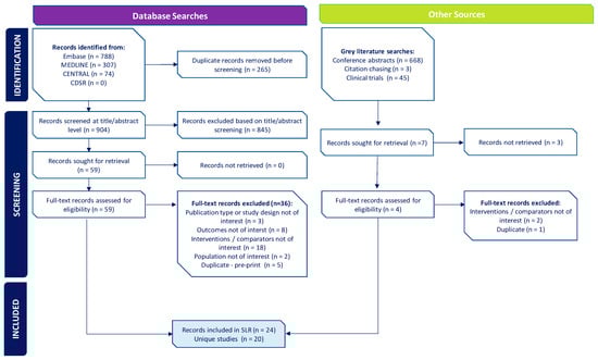 | Study Design | Clinical trials phases 1–3 (randomized/non-randomized) Post-hoc analysis of trials Pooled analysis of trials Observational studies, including prospective/retrospective cohort studies, case–control studies (including case-only designs), ecological studies | SLRs/MA b Pharmacodynamic/pharmacokinetic studies Genetic studies or cellular/molecular studies Trials without results Trial protocols Case reports, case studies, or case series Narrative reviews Editorials, theses, dissertations, book chapters, news articles |