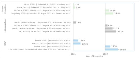 | Hause, 2022 [22] | General population | Coadmin. BNT162b2 booster + influenza vaccine | 61,390 | 7 days after vaccination | 39,818 (64.9) | 422,637 (58.9) | NR |