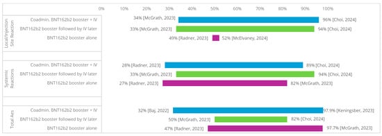 | Venuto, 2022 [32] | Healthcare workers | Coadmin. BNT162b2 booster + QIV | 64 | NR | Local pain: NR (50.6) | Headache: NR (18.8) Chills: NR (8.7) Myalgia: NR (17.3) Joint pain: NR (11.5) Lethargy: NR (7.2) Fever: NR (27.4) | NR |