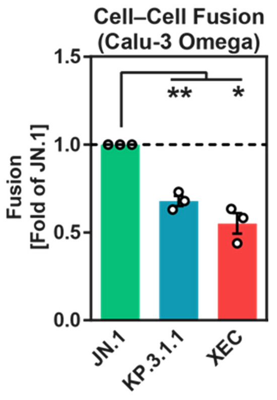 3.4. Reduced Cell–Cell Fusion Mediated by KP.3.1.1 and XEC S Proteins Compared to JN.1 S Protein