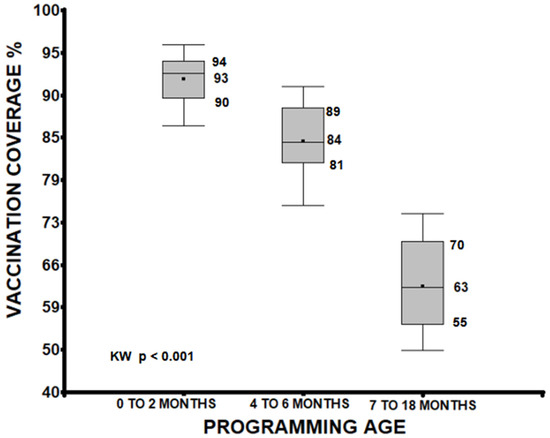 A median analysis of vaccination coverage, grouping doses administered between 0 to 2 months, 4 to 6 months, and 7 to 18 months, identified significant differences between these groups. Vaccines from 0 to 2 months showed higher coverage (median 93%) than those from 4 to 6 months (median 84%) and 7 to 18 months (median 63%). A progressive decrease was observed as the scheduled age increased (p < 0.001), and the groups were also different from each other (0 to 2 vs. 4 to 6, 0 to 2 vs. 7 to 18, 4 to 6 vs. 7 to 18 months p < 0.001; see Figure 1).