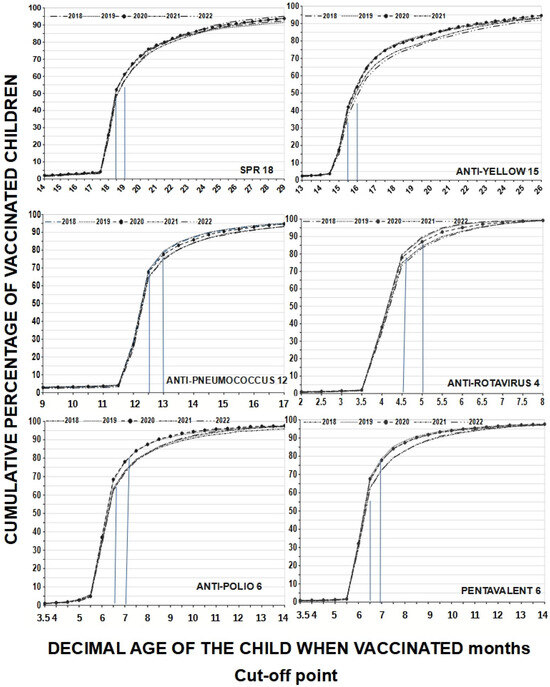Adherence to the vaccination schedule according to cumulative percentages of vaccinated children by age at which they were vaccinated and type of vaccines received in protective doses by year evaluated (from 2018 to 2022); cut-off points are represented by blue lines. We see that adherence increases with increasing decimal age, but those vaccinated between 6.00 and 6.99 months are in the 6-month-old category.
