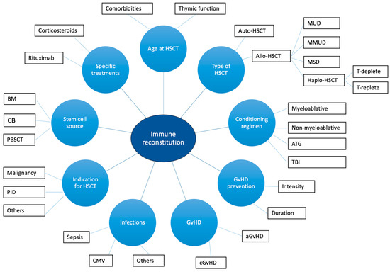IR is influenced by numerous factors, including graft-versus-host disease (GvHD), infections, age, type of HSCT (allogenic HSCT, autologous HSCT, haploidentical HSCT), the source of stem cells, the indication to HSCT, and conditioning regimen [37,38,45] (Figure 1). GvHD can affect IR through the induction of thymic damage, with consequent reduced thymic output of naïve T cells and reduced TCR repertoire diversity [46]. Moreover, corticosteroids administered to treat GvHD exacerbate apoptosis of thymocytes and thymic atrophy [46]. Infections (mainly, cytomegalovirus infection) can cause thymic damage [46]. Also, reduced levels of B-cell progenitors, non-switched memory B cells, and regulatory B cells are detected in patients with chronic GvHD (cGvHD) [41,46,47]. The decline in the thymic function observed with aging contributes to differences in the IR between adults and children [46]. The thymic function can also be impaired by myeloablative conditioning, cyclophosphamide, total body irradiation, and anti-thymocyte globulin [46,48]. On the other hand, rituximab negatively affects B-cell reconstitution and function [49]. Finally, patients undergoing HSCT for IEIs with altered thymic function show reduced naïve T cell recovery and reduced TCR repertoire diversity, as expected [50]. Data regarding the role of the stem cell source are still non-univocal [51]. However, according to the literature data, the use of cord-blood (CB) stem cells is associated with a rapid B-cell reconstitution compared to bone marrow (BM) and peripheral blood stem cell transplantation (PBSCT) [52,53,54]. On the other hand, patients receiving non-manipulated PBSCT commonly achieve a faster T-cell recovery [51]. Interestingly, in pediatric patients, long-term T-cell reconstitution develops with comparable timings between CB and BM recipients [55]. Finally, special considerations should be made regarding auto-HSCT and haploidentical HSCT.