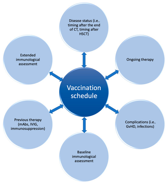 The challenge of personalized vaccine strategy is of significant clinical relevance in the pediatric hematology and oncology setting. Indeed, current guidelines highlight some universal parameters (i.e., timepoints from the end of chemotherapy or HSCT) to define the vaccine schedule. However, there is substantial heterogeneity among patients in these categories. To address this variability, vaccine strategies tailored to each patient’s clinical and immunological profile are essential, with the final aim of reducing the infectious risk in this delicate category of patients.