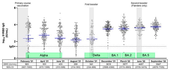 Overview of S1RBD IgG antibody levels among NHRs (n = 200) in Belgium from February 2021 to September 2022. S1RBD IgG geometric mean antibody concentrations (GMC) in IU/mL and 95% confidence intervals are presented below each timepoint and presented as log10 GMCs by blue lines with error bars. The horizontal dashed line represents the cutoff for SARS-CoV-2 seropositivity (log10 26 IU/mL). Grey bars indicate the timing of the vaccination rounds in the nursing homes included in the subset. Green bars indicate epidemiological waves in Belgium with the respective dominant variant of concern [,]. IU/mL: international units/mL; CI: confidence interval. BA.1: Omicron BA.1; BA.2: Omicron BA.2; and BA.5: Omicron BA.5.