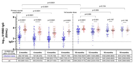 S1RBD IgG dynamics in infection-naive (n = 119) and infection-primed NHRs (n = 81) after primary course vaccination and first booster administration. Blue dots represent infection-naive NHRs, red dots represent infection-primed NHRs. S1RBD IgG geometric mean concentrations (GMC) in IU/mL with 95% CI are presented per timepoint for all subjects and separate for infection-naive/infection-primed subjects below the graph and log10 GMCs by horizontal lines and error bars for the latter. The mixed effects model and unpaired t-tests were applied. The first timepoint after vaccination was considered as baseline. The lower lines with p-values represent the comparison between infection-naive and infection-primed NHRs within one timepoint, while upper lines represent comparisons between timepoints for infection-naive and infection-primed NHRs combined. NHRs with a breakthrough infection and those who received a second booster were excluded at that respective timepoint. The horizontal dashed line represents the cutoff for SARS-CoV-2 seropositivity (log10 26 IU/mL). IU/mL: international units/mL. CI: confidence interval.