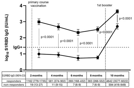 Geometric mean S1RBD IgG concentrations among responders (squares) (n = 60) and non-responders (dots) (n = 61) to primary course vaccination before and after first booster dose. Geometric mean S1RBD IgG concentrations (GMCs) in IU/mL with 95% confidence intervals are presented under each timepoint per group. Log10 GMCs are represented by dots among vaccine non-responders and squares among responders after primary course vaccination (month 2, 4, 6, and 8) and after the first booster dose (month 10) with error bars (95% CI). SARS-CoV-2 breakthrough cases were excluded from the analysis after the timepoint of infection (n = 23; 14 among non-responders, 9 among responders). Non-responders who remained seronegative after the first booster were excluded from this comparison for month 10. P-values are shown for the comparison between responders and non-responders per timepoint. The horizontal dashed line represents the cutoff for SARS-CoV-2 seropositivity (log10 26 IU/mL). IU/mL: international units/mL. CI: confidence interval.