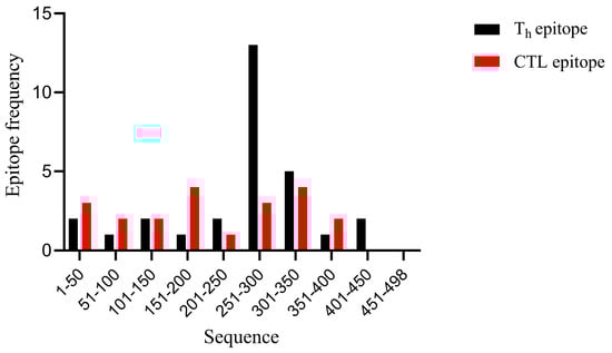 Using NetCTL1.2 (http://www.cbs.dtu.dk/services/NetCTL/ (last accessed on 15 December 2022)), IEDB-MHCI (http://tools.immuneepitope.org/mhci/ (last accessed on 15 December 2022)), and SYFPEITHI (http://www.syfpeithi.de/ (last accessed on 15 December 2022)), we predicted CTL epitopes in the NP protein of the A/Darwin/6/2021 (H3N2) strain. To perform this analysis, we entered the full-length amino acid sequence of NP, selected ’human’ as the species, and chose the dominant allele HLA-A*02:01 [], which represents the global population. We set the peptide length to 9 and identified the top 14 epitopes as candidate epitopes. Additionally, for the prediction of Th epitopes in the NP protein of A/Darwin/6/2021 (H3N2), we utilized IEDB-MHCII (http://tools.immuneepitope.org/mhcii/ (last accessed on 15 December 2022)) and RANKPEP (http://imed.med.ucm.es/Tools/rankpep.html (last accessed on 15 December 2022)). In this case, we again entered the full-length amino acid sequence of NP and selected the dominant allele HLA-DRB1*0101 [], which is representative of the world population. The default parameters were applied to the remaining options, resulting in the selection of the top 15 epitopes as candidates. Furthermore, based on the predicted distribution of the target peptide across the entire NP sequence, a frequency distribution histogram was generated using GraphPad Prism 9.0.