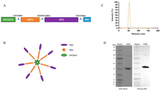 Construction and characterization of OMN nanoparticles. (A) OMN: the OVX313 peptide is connected to the N-terminus of six series-connected M2e units, along with one NP2. A His tag is added at the C-terminus, and all components are linked through a flexible linker (GGGSG/G4S) to minimize the steric hindrance. (B) Schematic representation of OMN heptamer nanoparticles. (C) Dynamic light scattering was employed to determine the average particle size of the OMN. (D) SDS-PAGE and Western blot identification of OMN protein.