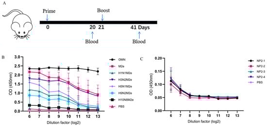 Comparison of breadth of serum antibody responses in immunized mice. (A) Immunization and sampling plan. (B) The cross-binding ability of the serum following secondary immunization with OMN to the M2e peptide of each subtype of influenza A virus. (C) The binding ability of antibodies from NP2 peptides in sera after secondary immunization with OMN. Specifically, immunoinformatics was utilized to predict the T-cell epitopes in the NP protein of the A/Darwin/6/2021 (H3N2) strain. The generated peptide NP2 was truncated into four segments, resulting in the corresponding peptide library (NP2-1, NP2-2, NP2-3, and NP2-4). The ELISA method was selected to detect the IgG antibody levels, with an initial dilution factor of 1:26 and a maximum dilution factor set to 1:213. Absorbance was measured at a wavelength of 450 nm. N = 6.