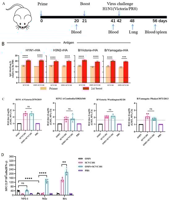 SCVC101 is a clinical-stage quadrivalent rHA-based influenza vaccine []. We sought to determine whether supplementing SCVC101 with OMN could enhance both the magnitude and breadth of protective immune responses. To achieve this, we first investigated whether OMN would interfere with the immunogenicity of SCVC101. Mice were immunized with (SCVC101+OMN) according to the schedule shown in Figure 4A. Serum samples were collected from the immunized mice on days 20 and 41, and the antibody levels against the four rHAs in SCVC101 were measured using ELISA. As shown in Figure 4B, the addition of OMN did not impair the antibody immunogenicity of SCVC101 against any of the four rHAs.