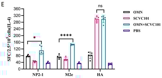 Evaluation of humoral and cellular immunity in mice immunized with SCVC101 and OMN alone or in combination. (A) The immunization, sampling, and challenge protocol for the mice is outlined. (B) Specific IgG titers in serum were measured three weeks post-immunization, with a sample size of n = 6. (C) Hemagglutination inhibition levels of mouse serum against various subtypes of the influenza virus were determined following the final immunization, n = 5. The viruses included the following: H1N1 A/Victoria/2570/2019, H3N2 A/Cambodia/E0826360/2020, B/Victoria/Washington/02/2019, and B/Yamagata/Phuket/3073/2013. The dashed line indicates the effective titer limit for HAI (≥1:40). (D,E) The ELISpot method was employed to quantify the levels of IFN-γ and IL-4 secreted by spleen lymphocytes, with a sample size of n = 5, including (D) the number of splenocytes secreting IFN-γ and (E) the number of splenocytes secreting IL-4. (ns: no significance; *: p < 0.05; **: p < 0.01; ***: p < 0.001; ****: p < 0.0001).