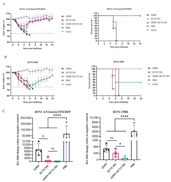 To evaluate the OMN-induced cross-reactive antibody production in mice, female BALB/c mice (n = 6 per group) were immunized intramuscularly with OMN (10 μg/mouse) or PBS on days 0, 21, and 42. Blood samples were collected for testing on day 62. In the co-administration of OMN and the seasonal influenza vaccine SCVC101 experiment, the female BALB/c mice are immunized twice with OMN (10 μg/mouse), or SCVC101 (1.5 μg/HA), or co-administered OMN (10 μg/mouse) and SCVC101 (1.5 μg/HA), at an interval of 21 days. PBS serves as the control group (n = 25 per group). The SCVC101 vaccine was formulated with recombinant HA (1.5 μg rHA/each strain of virus/dose, 25 μL/dose) based on the WHO-recommended HA gene sequences for the Northern Hemisphere 2021–2022 influenza season and adjuvanted with CD-A (25 μL/dose) [], a MF59-like oil-in-water emulsion containing squalene. On the 20th day after the last immunization, splenocytes were harvested for an ELISpot analysis. On day 42, half of the mice were intranasally infected with a lethal dose of the A/Victoria/2570/2019 (H1N1) virus (1 × 106 TCID50/mouse), while the other half were intranasally infected with a lethal dose of the H1N1 (PR8) virus (5.62 × 105 TCID50/mouse). Six days post-challenge, the right lungs were harvested for a virus titration, and changes in the body weight and survival rates of the mice were monitored for two weeks following the challenge. Mice that experienced a weight loss exceeding 25% during the infection were euthanized.