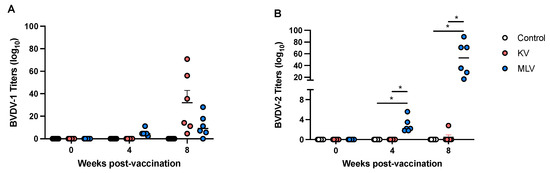 Serological responses to KV and MLV vaccines in serum of vaccinated white-tailed deer. Serum samples were collected at the indicated timepoints following vaccination and boost and assessed via virus neutralization assay. Neutralizing titers were determined for BVDV-1 (A) and BVDV-2 (B). Titers are expressed as the reciprocal (anti-log base 10) of the highest serum dilution able to inhibit CPE in the monolayer. * Indicates statistical significance (p ≤ 0.05).