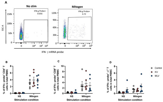 Detection of intracellular IFN-γ mRNA in white-tailed deer T cells using PrimeFlow. Peripheral blood mononuclear cells were isolated from whole blood samples and were either left unstimulated or stimulated with PMA/Ionomycin to induce cytokine production. PrimeFlow and flow cytometry were utilized to assess IFN-γ mRNA expression from CD4, CD8, and γδ T cells. Shown are the representative dot plots (A) of total PBMCs with and without PMA/Ionomycin stimulation, demonstrating the presence of IFN-γ mRNA staining. The frequencies of IFN-γ mRNA-positive CD4 (B), CD8 (C), and γδ (D) T cells from PBMCs collected from control (open circles), KV-vaccinated deer (orange circles), and MLV-vaccinated deer (blue circles) and stimulated with PMA/Ionomycin are shown. Values indicate mean frequency ± SEM.