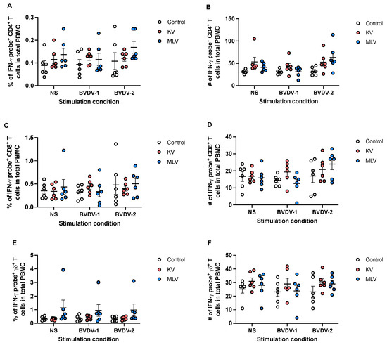 We then applied this approach to assess antigen-specific IFN-γ responses following vaccination. Following in vitro stimulation with BVDV-1 or BVDV-2a, we did not observe any significant changes in the frequency (Figure 4A) or number (Figure 4B) of CD4+ T cells expressing IFN-γ mRNA in vaccinated animals as compared to control animals. Similarly, we did not observe any significant changes in the frequency or number of CD8+ (Figure 4C,D) or γδ (Figure 4E,F) T cells expressing IFN-γ mRNA in response to BVDV antigen stimulation. Altogether, these data would suggest that while this assay can detect IFN-γ mRNA, neither KV nor MLV vaccinations induced an increased IFN-γ response at the time point analyzed.