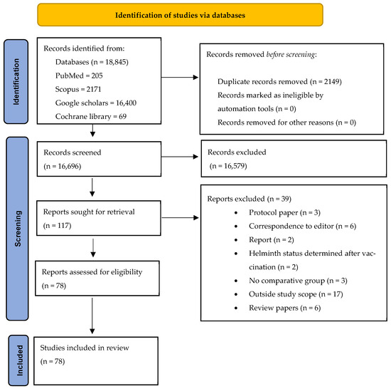 The review process began with the identification and removal of duplicates. Titles and abstracts of the retrieved articles were then screened to determine eligibility for inclusion in human and animal studies. In the third stage, full texts of articles identified as relevant during the second stage were thoroughly reviewed. At each stage, two reviewers independently assessed the articles, with a third reviewer resolving any disagreements through discussion to reach a consensus. Studies were included if they compared immune responses, disease outcomes, or vaccine efficacy between helminth-infected and uninfected groups, or between groups treated and untreated with anthelmintics. Additionally, the helminth status of participants had to be laboratory-confirmed prior to vaccination, with the subsequent measurement of immunological outcomes.