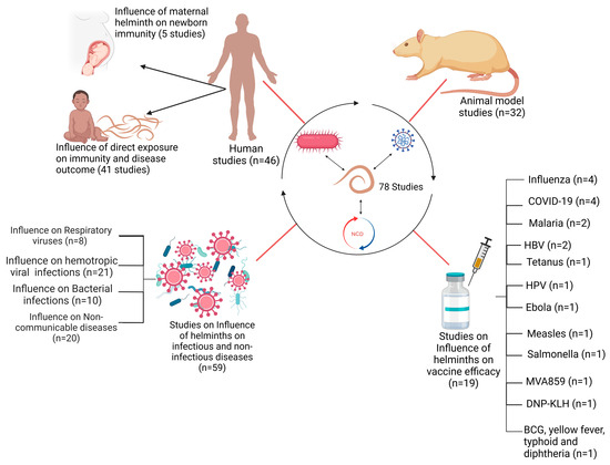 A total of 78 published articles were selected for inclusion in the review. Of these, 32/78 of the studies involved animal models, whereas 46/78 studies involved human subjects (Figure 2). Within the subset of human studies, 5/46 investigated the impact of maternal helminth infection on the immune responses of offspring. The remaining 41/46 studies assessed the effects of direct helminth exposure on other infections and vaccine outcomes. A total of 59 of all included 78 studies investigated the effects of helminths on infectious and non-infectious disease outcomes, with these studies being further categorized based on the type of co-infection: 29/59 on viral co-infections, 10/59 on bacterial co-infections, and 20/59 on non-communicable disease co-infections (Figure 2). Furthermore, 19/78 of the included studies examined the influence of helminths on vaccine efficacy. This group consisted of ten (10) human studies and nine (9) animal studies. The studies collectively reported on vaccine efficacy against several diseases, including COVID-19, Ebola, tuberculosis, Influenza, tetanus, typhoid fever, malaria, Human Papillomavirus infection (HPV), yellow fever, measles, diphtheria, and HBV infection (Figure 2).