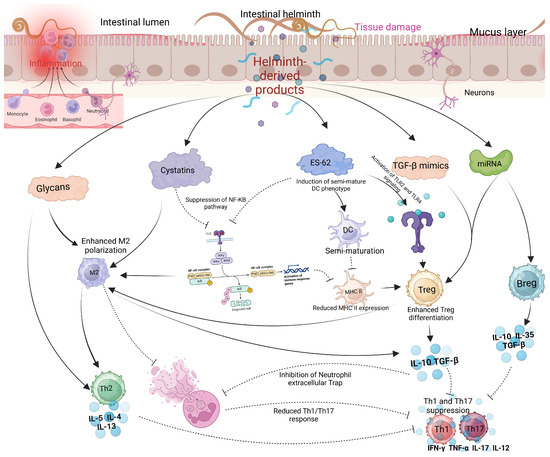 Modulatory effects of helminth-derived products on immune cells. Helminths produce several immunomodulatory molecules, including glycans, cystatins, ES-62, TGF-β mimics, and miRNAs. Glycans and cystatins promote M2 macrophage polarization, while cystatins and ES-62 suppress the NF-κB pathway, reducing the activity of Th1 and Th17 cells. Additionally, TGF-β mimics and miRNAs enhance the activation of Tregs and Bregs, further inhibiting Th1 and Th17 responses (created using BioRender.com).