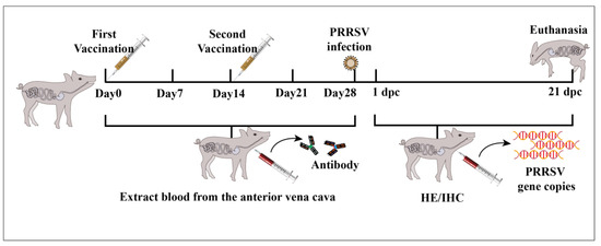 Schematic diagram of the experimental procedure. After immunization of piglets with the vaccine, blood was collected at one-week intervals; 28 days after immunization, blood was collected at one-day intervals, and clinical signs of piglets were recorded and scored; at the end of the experiment, all surviving piglets were euthanized, pathological changes in piglets’ organs were observed, and tissue samples were collected to determine the viral loads contained in the tissues.