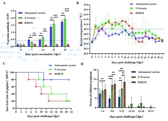 Clinical symptoms of piglets. (A) After immunization of piglets, blood samples were collected weekly to measure serum N protein antibodies. A total of 28 days after immunization, piglets were infected with 2 × 106 TCID50 PRRSV, and their rectal temperature (B) was measured daily. Clinical survival curves (C) and scoring of clinical symptoms (D) were recorded for each group of piglets. GraphPad Prism 9 was used to analyze data through one-way ANOVA. ns indicates p ≥ 0.05, no significant difference, while significance is represented by * p < 0.05, ** p < 0.01, *** p < 0.001.