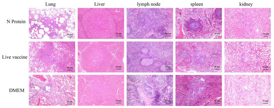 The pathological section results of piglet tissue revealed distinct pathological changes across different experimental groups (Figure 5). The N protein group showed associated alveolar interstitial congestion; the DMEM group had marked abscess areas in lung tissue with inflammatory cell infiltration; the live vaccine group showed signs of mild pulmonary fibrosis in lung tissue with a large inflammatory cell infiltration. This may be due to the fact that the live attenuated vaccine may simultaneously activate an overly strong inflammatory response (e.g., Th1-type cellular immunity or cytokine storm), resulting in massive localized infiltration of immune cells (e.g., lymphocytes, macrophages) into lung tissue, which is microscopically manifested as a denser accumulation of inflammatory cells. Mild hepatocyte degeneration was observed in the liver tissue of the N protein vaccine group, with small vacuoles present in the cytoplasm; the DMEM group showed punctate necrosis of liver tissue, accompanied by bleeding and inflammatory cell infiltration; the lung tissue of the live vaccine group showed hepatic steatosis, with a large number of fat vacuoles and congestion in the liver lobules. The submandibular lymph node tissue structure of the N protein vaccine group was intact, with obvious germinal centers visible; the DMEM group showed proliferation of lymphoid follicles in the submandibular lymph node tissue, decreased germinal centers, and mild fibrosis; the lymphoid follicular structure of the submandibular lymph node tissue in the live vaccine group was loose and severely fibrotic. The splenic corpuscle structure in the spleen tissue of the N protein vaccine group was clear and complete, with visible central arteries. The DMEM group had intact morphology and loose splenic corpuscles, with central arteries visible in splenic tissue. The morphology and structure of splenic corpuscles in the spleen tissue of the live vaccine group was loose and disordered, with thickening of the central artery and arterial wall visible. The structure of renal glomeruli and tubules in the N protein vaccine group was clear and complete, and the lumen of the balloon is visible; the DMEM group showed significant infiltration of inflammatory cells around the glomeruli and renal tubules, with loose cytoplasm and mild staining of renal tubules, and irregular lumens; the renal tubules in the live vaccine group showed signs of degeneration and necrosis, with pale cytoplasm and congested surrounding capillaries.