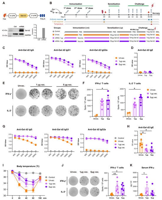 Immunogenicity and anti-allergy efficacy of the Gal d2 mRNA vaccine. (A) Construction of the Gal d2-mRNA and its translational efficiency in HEK-293T cells was assessed by western blot. (B) Experimental design. BALB/c mice (n = 12) were immunized three times at days 0, 7, and 14, followed by Gal d2 sensitization and i.g. challenge, consecutively. The final Gal d2 challenge was i.p. administered to induce anaphylaxis. (C,D) Gal d2-specific IgG, IgG1, IgG2a, and IgE in mice (n = 6) were measured at day 33. (E,F) Frequencies of the Gal d2-specific IFN-γ- or IL-2-producing T cells in spleens were measured by ELISpot assay. (G,H) At day 62 prior to the final allergen challenge, Gal d2-specific IgG, IgG1, IgG2a, and IgE in the mice (n = 6) were measured. (I) Following the final i.p. allergen challenge, rectal temperature of the mice was monitored. (J) Four hours post the final i.p. allergen challenge, levels of the Gal d2-specific IFN-γ or IL-2-producing T cells were quantified (n = 6) and the serum level of IFN-γ was measured (K). Non-parametric one-way ANOVA (Kruskal–Wallis) test was used for statistical analysis. * p ≤ 0.05, ** p ≤ 0.01.