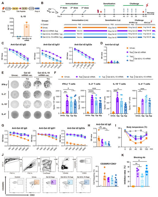 Immunogenicity and anti-allergy efficacy of the Gal d2-IL-10 mRNA vaccine. (A) Construction of the Gal d2-IL-10 mRNA (upper panel). Expression of IL-10 in the culture supernatant was determined by ELISA following mRNA transfection into HEK-293T cells (lower panel). (B) Experimental design. BALB/c mice (n = 12 each group) were immunized three times at days 0, 7, and 14, followed by Gal d2 sensitization and i.g. challenge, consecutively. The final Gal d2 challenge was i.p. administered to induce anaphylaxis. (C,D) Gal d2-specific IgG, IgG1, IgG2a, and IgE in the mice (n = 6 each group) were measured at day 33. (E,F) Frequencies of the Gal d2-specific IFN-γ-, IL-2-, IL-4-, or IL-10-producing T cells in spleens were measured by an ELISpot assay. (G,H) At day 62, prior to the final allergen challenge, Gal d2-specific IgG, IgG1, IgG2a, and IgE in the mice (n = 6) were measured. (I) Following the final i.p. allergen challenge, rectal temperature of the mice was monitored. (J) Four hours post the final i.p. allergen challenge, frequencies of activated basophils were measured by FACS. (K) The allergen-blocking capacity of the vaccine-induced antibodies was measured (n = 5 each group). Inhibition rate is shown. Non-parametric one-way ANOVA (Kruskal–Wallis test) was used for statistical analysis. * p ≤ 0.05, ** p ≤ 0.01, *** p ≤ 0.001, **** p ≤ 0.0001.