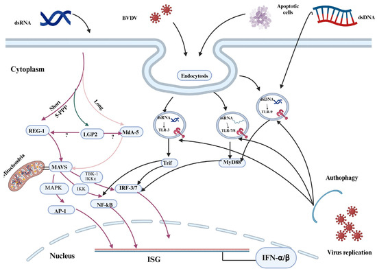 BVDV infection causes immunosuppression and alters the pathogen recognition the receptor (PRR) and Toll-like receptor (TLR) signaling pathway in macrophages (Figure 3). Schaut et al. [39] showed that the expression of pro-inflammatory cells differs between BVDV 2-infected and non-infected macrophages in a manner that depends on both species and biotypes of BVDV. Generally, BVDV-2-infected macrophages are known to impair the production of pro-inflammatory cytokines in response to ligation with TLR, except for TLR7 [40].