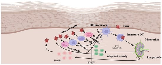 Model for the interaction between the innate and adaptive immune system and BVDV biotypes. Infection of mucosal or epithelial surfaces with cpBVDV activates cytokine expression, including IFNα from different cell types and dendritic cells (DCs). These cytokines induce effector cells of the innate immune response, such as eosinophils, macrophages, and natural killer cells (NK cells). Subsequently, viral replication is blocked due to the combined effect of cytokines and effector cell function. Infection with cpBVDV creates an environment that facilitates the migration of antigen-capturing DCs to the lymph nodes, where they undergo maturation. DCs probably withstand the lytic effect of cpBVDV and migrate to the local lymph node. The DCs with the antigen arrive at the lymph node and present the antigen through MHC I to antigen-specific lymphocytes. Eventually, the activated T lymphocytes (CTLs and helper T cells) migrate to the site of infection to eliminate the virus or virus-infected cells. Mature plasma cells are generated from activated B cells that reach the GC or far in the lymph node and produce virus-neutralizing antibodies. Unlike cpBVDV infection, ncpBVDV infection cannot stimulate an early cytokine response. Consequently, the viral replication is unlimited, and activation of DCs is reduced. DCs, whether they have captured the virus or not, migrate to the local lymph node. Those that encounter the virus within the lymph node produce large quantities of IFNα. The concentration of IFNα in the circulation and tissues increases, ultimately activating the DCs to inhibit viral replication. However, during this time, the ncpBVDV virus has already disseminated throughout the animal body [13]. DCs, dendritic cells; NK cells, natural killer cells; MHC I, major histocompatibility; CTLs, cytotoxic T lymphocytes; GC, germinal center; CD, cluster of differentiation; NET, neutrophil extracellular traps. Created with BioRender.com.