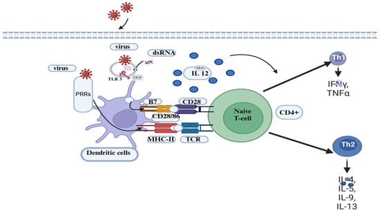 Antigen-presenting cell activation and interactions with T cells. On antigen-presenting cells (e.g., DCs), the viral PAMPs bind to PRRs. Matured and activated DCs migrate with the carried antigen to lymph nodes, where they encounter naïve T lymphocytes and present the processed peptides loaded onto MHC II to CD4+ cells. These CD4+ cells then differentiate into Th1 and Th2 cells in the presence of cytokines and interleukins. Th1 cells activate macrophages to phagocytize and kill the pathogen, and helper B cells produce antibodies against the pathogen. In viral infections such as BVDV, the activation of cytotoxic T cells (CTL) by CD4+ cells plays a crucial role in mounting an effective immune response. DCs with the processed peptides on MHC-I migrate to lymph nodes and bind to naïve CTLs. This activated CTL releases effector molecules such as perforin, granzymes, and granulysin to kill virus-infected cells. PRR, Pathogen Recognition Receptor; PAMP, Pathogen-Associated Molecular Patterns. TLRs, Toll-like receptors; B7/CD80/CD86 represents APCs co-receptor; CD28 denotes T cell co-receptor; and MHC II, Major Histocompatibility II. Created with BioRender.com.