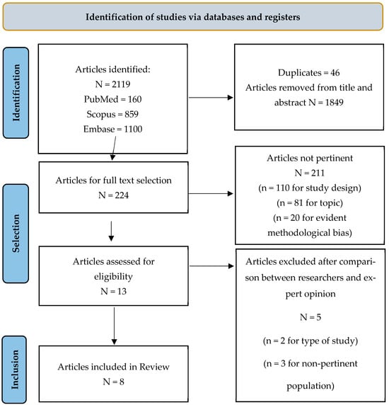 The search strategy identified 2119 articles from the PubMed-Medline, Embase, and Scopus databases. After the removal of 46 duplicates and the exclusion of 1849 articles based on title and abstract screening, 224 articles were selected for full-text assessment. Among these, 211 articles were deemed irrelevant (110 for study design, 81 for topic, and 20 for evident methodological bias), and 13 full-texts were assessed for eligibility. Following further review and expert opinion, five additional articles were excluded (Supplementary File S1). The final selection process resulted in the inclusion of eight primary studies, conducted between 2015 and 2024. The PRISMA flowchart is presented in Figure 1, and a summary of the included studies is provided in Table 1.