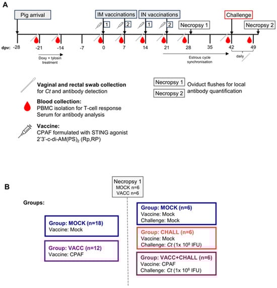 The animal trial was carried out as depicted in Figure 1A. Thirty 15-week-old Cs-pre-exposed outbred pigs (all female) from the University-owned research farm were brought to the University of Veterinary Medicine Vienna. Rectal swabs were collected, and a Chlamydiaceae qPCR, followed by a Cs-specific qPCR assay was performed [36], confirming that all pigs showed rectal, but not vaginal, shedding of Cs. Pigs were then randomly distributed into the groups outlined in Figure 1B. After an acclimatization period of 7 days, pigs were administered 12.5 mg/kg body weight of doxycycline (Pulmodox 5%, pig premix for medicated feeding stuff, Virbac, France) daily orally for 8 days and, additionally, during the last 3 days, 10 mg/kg body weight of tylosin (Axentyl® 200 mg/mL, Virbac, France) intramuscularly once a day to reduce Cs burden. After this, a resting period of 14 days was included to provide time for a potential anti-Cs immune response to decline. Analysis of rectal swabs using a Cs-specific qPCR confirmed that the pigs were negative for Cs after antibiotic treatment. At 0 days post (first) vaccination (dpv), pigs received the first intramuscular (IM) vaccination followed by a second IM vaccination 7 days later. The vaccine did not elicit any local adverse reactions at the injection site. At 14 dpv and 21 dpv, pigs received vaccinations intranasally (IN). The vaccinated group received CPAF adjuvanted with STING agonist (2′3′-c-di-AM(PS)2 (Rp,RP)) and the MOCK group received PBS (see Section 2.3). As outlined in Figure 1A, blood and vaginal swabs were collected every 7 days: 0, 7, 14, 21, 28 dpv. At 28 dpv, the pre-challenge necropsy took place with n = 6 MOCK and n = 6 VACC pigs to collect oviduct flushes. Pigs were anesthetized via intramuscular injection of Ketaminhydrochlorid (Ketamidor®, 20 mg/kg body weight, Vétoquinol, Lure Cedex, France) and Azaperon (Stresnil®, 40 mg/mL, 1–2 mg/kg body weight, Elanco, Greenfield, IN, USA), followed by euthanasia through intracardiac injection of T61® (tetracaine hydrochloride, mebezonium iodide, and embutramide; 1.0 mL/10 kg body weight, MSD Animal Health, Kenilworth, NJ, USA). The remaining 18 pigs were divided into the following groups: MOCK (no vaccine, no challenge), CHALL (no vaccine, but challenged), and VACC + CHALL (vaccinated and challenged). To facilitate the trans-cervical challenge, estrous cycles were synchronized with the steroidal progestin altrenogest (Altresyn 4mg/mL Ceva Tiergesundheit, France) from 20 to 37 dpv. On day 38 dpv, 1000 international units of serum-Gonadotropin (Folligon® 1000 I.U., MSD Tiergesundheit, Vienna, Austria) were injected intramuscularly, followed by a Choriongonadotropin (1500 I.U.; Chorulon®, MSD Tiergesundheit, Austria) injection 72 h later (41 dpv). A period of 24 h later (42 dpv), the cervix was open, and pigs were inoculated trans-cervically either with 20 mL sucrose phosphate glutamic acid (SPG) buffer (MOCK) or with 1 × 108 inclusion-forming units (IFU) Ct serovar D in 20 mL SPG by inserting an intrauterine insemination catheter connected to an 80 mL semen tube. To monitor infection, pigs were swabbed cervically daily. On the day of the challenge (42 dpv) and one week after the challenge (49 dpv), blood samples and additional swabs were taken. Eight days after the challenge, pigs were sacrificed as described above to collect oviduct flushes and uterine swabs.