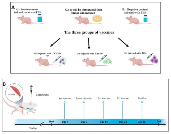 The mice were divided into five groups (n = 6), and each mouse was assigned a unique identification number. The study compared DCs, CH-NPs, and DC-CH-NPs as vaccine formulations. Groups I and II served as control groups. Groups III, IV, and V were vaccinated with DCs, CH-NPs, and DC-CH-NPs. Experimental outcomes were measured through body weight during the study and spleen weight at the end. On days 1, 14, and 21, Groups III–V received three intramuscular vaccine doses in the left flank. On day 7, mice were injected subcutaneously with syngeneic breast cancer cells in the mammary area. Group II (positive control) received tumor cells without treatment. Group III received CH-NPs (46.5 μg), Group IV received 1 × 105 DCs in 100 μL PBS, and Group V received 1 × 105 DCs associated with 46.5 μg of CH-NPs in 100 μL PBS after washing (Figure 1).