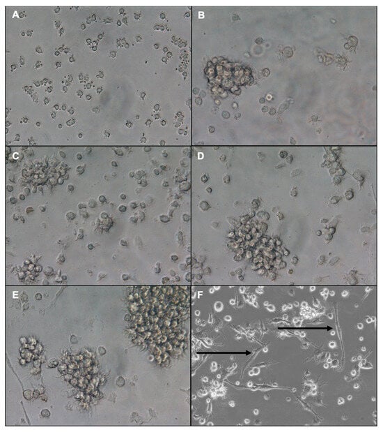 Morphological differentiation of mouse bone marrow-derived dendritic cells during culture. BM cells were cultured for seven days in the presence of GM-CSF and IL-4. On day 1, the cells appeared small and round (A). From days 2 to 6, cells began aggregating and forming clusters (B–D). On day 7, unstimulated DCs had irregular shapes and short cytoplasmic projections (E), while LPS-stimulated mature DCs were elongated and irregular, with numerous long projections (F). Images were captured with an inverted microscope at 20× and 40× magnification at the Immunology Unit, KFMRC, King Abdulaziz University. Arrows in (F) highlight the dendritic projections.