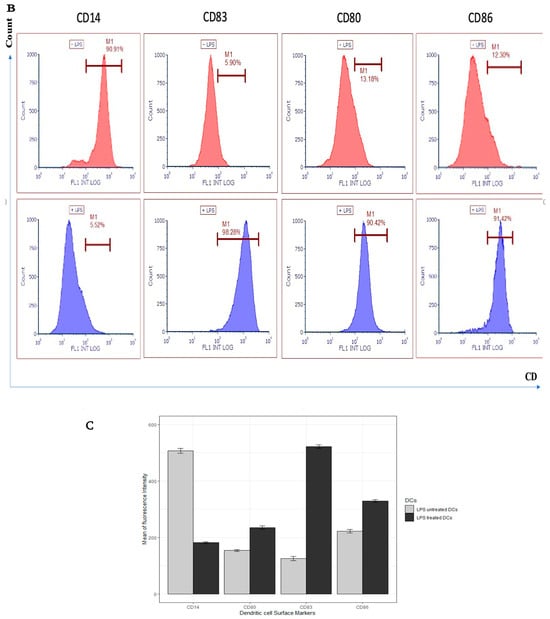 Phenotypic analysis confirmed successful DC maturation, characterized by the upregulation of CD80, CD86, and CD83 surface markers, along with decreased CD14 expression—hallmarks of functional antigen-presenting cells [31,32]. Interestingly, CD86 expression exceeded CD80, aligning with previous reports showing that CD86 is rapidly expressed upon stimulation, whereas CD80 requires more sustained signaling for surface expression [33,34]. Tumor necrosis factor (TNF) has also been implicated in the upregulation of CD80 [34,35].