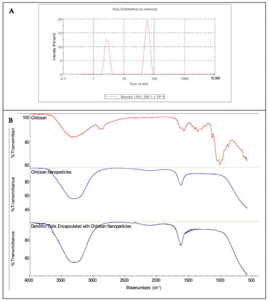 Fourier transform infrared (FT-IR) spectroscopy (Nicolet 6700 FT-IR, Thermo Fisher Scientific, Waltham, MA, USA) was used to verify the chemical structure and presence of functional groups in both chitosan and CH-NPs. This step was essential to confirm nanoparticle formation. FT-IR analysis revealed peaks at 3321 cm−1 corresponding to the –OH and –NH2 stretching vibrations, indicating the functional integrity of the particles. FT-IR spectroscopy was used to confirm the presence of functional groups characteristic of chitosan. While the observed –NH2 and –OH peaks are consistent with chitosan, they are not unique indicators of nanoparticle formation and are commonly present in both chitosan and TPP-crosslinked formulations. Thus, FT-IR alone does not confirm nanoparticle synthesis or DC interaction and should be interpreted accordingly.