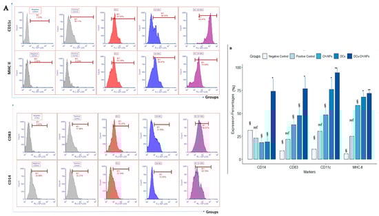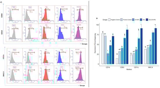 CD14 expression was highest in the positive control group (71.6 ± 5.1%), followed by DC-CH-NPs (70.8 ± 3.7%), DCs (47.4 ± 12.7%), and CH-NPs (26.7 ± 9.4%). CD11c and MHC-II expression were significantly increased in the DC-CH-NPs group (90.8 ± 11.9% and 91.2 ± 10.8%, p = 0.02 and 0.005, respectively) compared to the other vaccinated groups (Figure 5C,D).