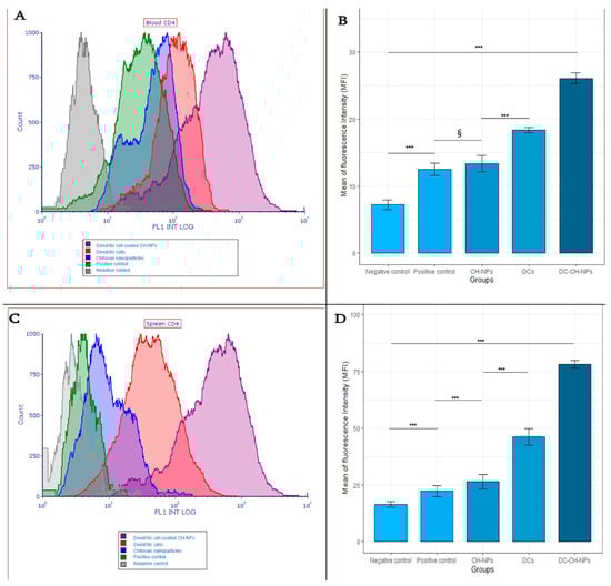 The mean fluorescence intensity (MFI) of CD4+ T cells in blood differed significantly across groups (one-way ANOVA, p < 0.001). All treatment groups showed significantly higher MFI values than the negative control group (Tukey post-hoc test, p < 0.001). The CH-NPs group (MFI = 12.52 ± 2.1) and the positive control group (MFI = 13.34 ± 1.6) did not differ significantly (p = 0.614), indicating limited activation. MFI values were significantly higher in the DC-CH-NPs group (78.20 ± 1.4), followed by the DC (46.14 ± 1.3) and CH-NPs (26.52 ± 1.5) groups (p < 0.001 for all comparisons). The spleen showed higher overall MFI values than blood across all groups (Figure 6B,D).