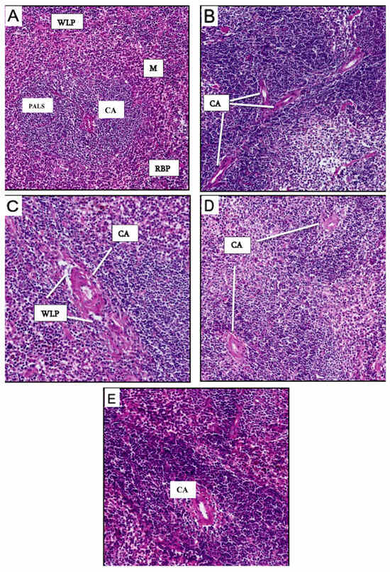 In the positive control group, histological examination of the spleen revealed several pathological changes due to tumor induction, including tumor cell infiltration and necrosis. The RBP and WLP appeared expanded, and their structural boundaries were less distinct. The normal architecture of the germinal center was disrupted, indicating splenomegaly. Anomalies in the central artery (CA) were noted, including multiple arteries within the pulp (Figure 7B).