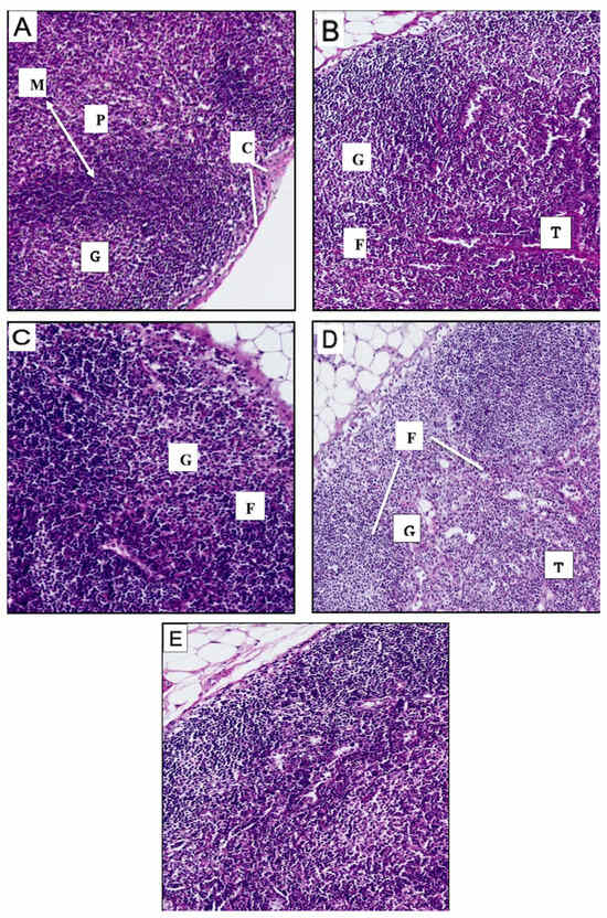 Histological analysis of lymph nodes from experimental mouse groups. (A) Lymph node from the negative control group showing a well-defined capsule, subcapsular sinus (C), cortex with lymphatic nodules (F), a rounded germinal center (G), paracortex (P), and medulla (M). (B) Positive control group lymph node infiltrated by tumor cells (T), with diffuse lymphatic nodules (F) and degenerated germinal center (G). (C): Lymph node from CH-NPs-vaccinated mice displaying irregular, non-circular germinal centers (G) and naked lymphoid follicles (F). (D): Lymph node from DC-vaccinated mice showing low follicular density, tumor cell infiltration (T), and reduced structural definition of lymphatic nodules (F) and germinal centers (G). (E): Lymph node from DC-CH-NPs-vaccinated mice exhibiting a dense accumulation of paracortical lymphocytes. All tissue sections were stained with hematoxylin and eosin (H&E) and scanned using a Grundium Ocus scanner (Grundium, Tampere, Finland). Magnification: 10× (100 μm resolution) for (A–D) 40× (50 μm resolution) for (E).