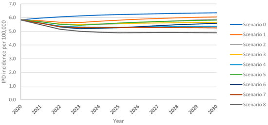- Vaccine formulation—replacement of PPSV23 (scenario 0) with either PCV20 (scenarios 1–4) or V116 (scenarios 5–8);