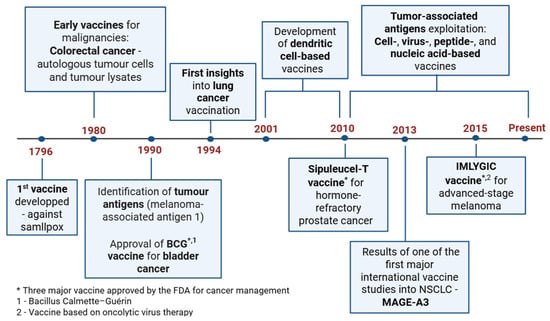 Evolution of vaccines from their first development up to their application in cancer treatment. Created with BioRender.com. Available online: http://biorender.com/ (accessed on 8 April 2025).
