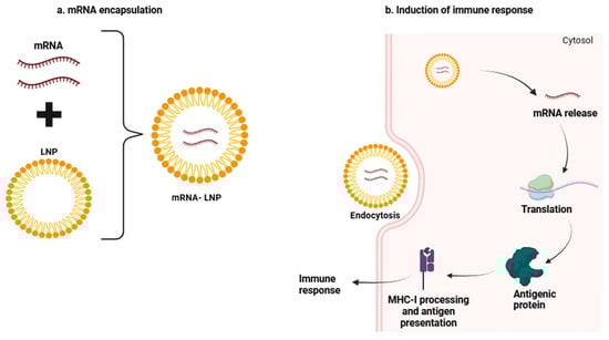 mRNA vaccine formulation and immune response induction. (a) mRNA is encapsulated within a lipid nanoparticle (LNP) to enhance stability and facilitate efficient delivery. (b) The mRNA–LNP complex enters the cell through endocytosis, where the mRNA is released into the cytosol and translated into an antigenic protein. This protein binds to the major histocompatibility complex I (MHC-I), being presented to cytotoxic T cells, activating them, and finally triggering an immune response. Created with BioRender.com. Available online: http://biorender.com/ (accessed on 12 February 2025).