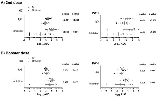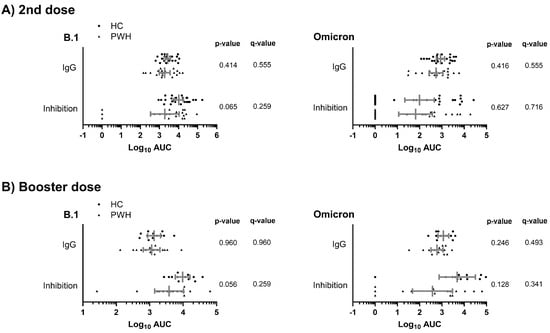 We found similar humoral responses (anti-SARS-CoV-2 S IgG and inhibition of ACE2-S interaction) to the B.1 lineage and Omicron variant between PWH and HC groups after the second and booster doses of the COVID-19 vaccine (q-value > 0.05; Figure 1A,B). Therefore, these results indicate that the humoral response in the PWH group may be comparable to that of the HC group.