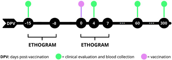 Experimental design. At −15, 4, 60, and 300 days post-vaccination (DPV), blood sampling and clinical examination of each of the animals were performed. Vaccination was performed at day 0 by subcutaneous injection in the hypogastric region. An ethogram was evaluated one week after screening and one week post-vaccination.