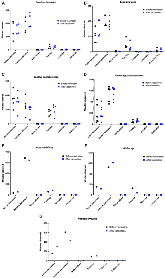 Ethogram of neotropical primates before and after vaccination with the attenuated YF 17DD strain. Frequency of behaviors observed 7 days before vaccination and 7 days after vaccination. (A) Saguinus imperator; (B) Lagothrix cana; (C) Sapajus xanthosternos; (D) Alouatta guariba clamitans; (E) Aotus infulatus; (F) Ateles sp. and (G) Pithecia irrorata. The differences between the observation periods were calculated using analysis of variance with the Sidak test for paired multiple comparison. Data were compared between pre- and post-vaccination by ANOVA followed by Sidak’s multiple pairwise comparison test.