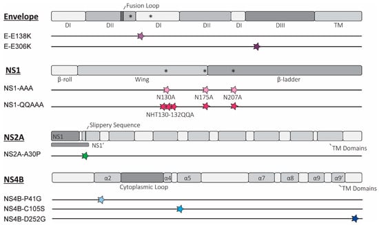 Another well-conserved mechanism of attenuation in orthoflaviviruses is the engineered removal of the glycosylation sites in the NS1 protein. NS1 is a complex non-structural glycoprotein that forms both dimers and hexamers, facilitating its numerous different intracellular and extracellular roles in replication and pathogenesis [21]. The loss of one or more of the highly conserved N-glycosylation sites disrupts the maturation and oligomerisation of the protein, interfering with NS1’s role in replication and its ability to form secreted hexamers—structures that have been implicated strongly in viral pathogenesis [22]. In vivo studies on DENV, YFV, WNV, ZIKV, and TMUV have all shown that mutating (or removing) the NS1 glycosylation sites results in significant increases in survival after infection [10,23,24,25,26,27].